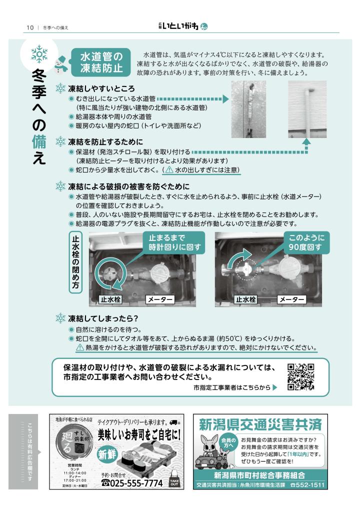 糸魚川市ホームページ(広報いといがわ 2024年12月発行 No.237)にて配布がございましたので 今一度日頃の備えをよろしくお願いいたします。 |