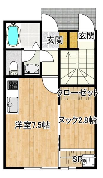 間取り:1KS(洋室7.5畳・ヌック2.8畳)※2Fは1畳の物入スペース有